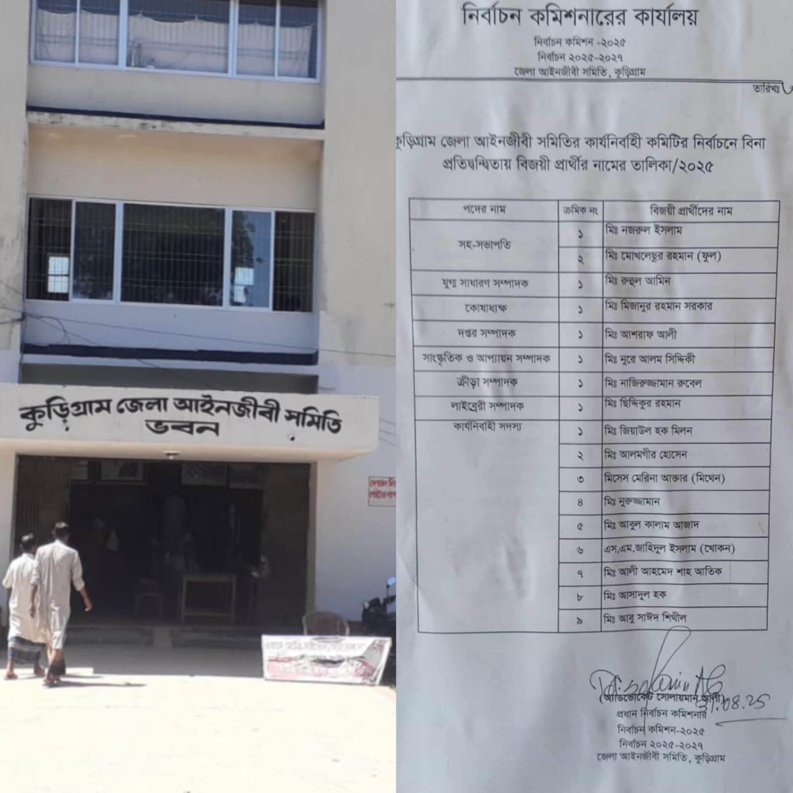 কুড়িগ্রাম জেলা আইনজীবী সমিতির নির্বাচনে সহসভাপতি, যুগ্ম সাধারণ সম্পাদকসহ সাতটি পদ ও কার্যনির্বাহী সদস্যপদে মোট ১৭ জন বিনা প্রতিদ্বন্দ্বিতায় জয়ী হয়েছেন।