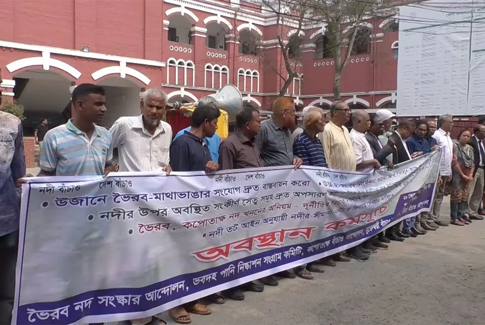 ভৈরব নদে অপরিকল্পিত ব্রিজ নির্মাণ বন্ধের দাবিতে মানববন্ধন