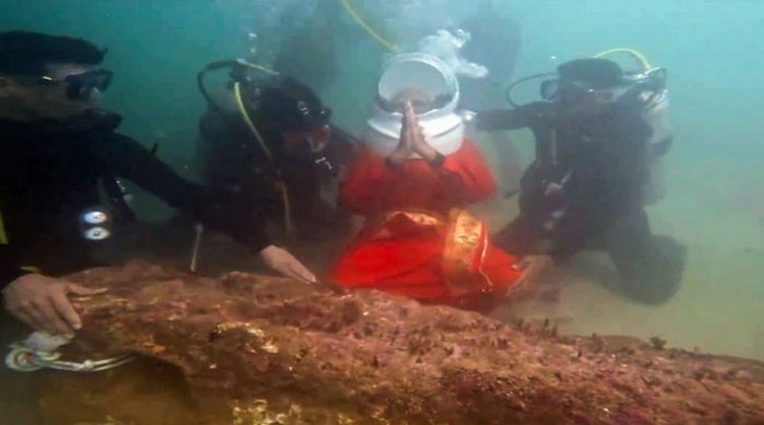 আরব সাগরের তলায় গিয়ে পূজা করেছেন ভারতের প্রধানমন্ত্রী নরেন্দ্র মোদি। রোববার তিনি গুজরাটের পাঞ্চকুনি সমুদ্রসৈকতে ডুবন্ত দ্বারকা নগরী দর্শন করেন। পানির নিচে তলিয়ে যাওয়া দ্বারকাধীশ মন্দিরে পূজা করেন। দ্বারকা সবসময়ই