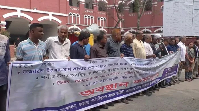 উচ্চ আদালতের নির্দেশনা উপেক্ষা করে যশোরের ভৈরব নদে অপরিকল্পিত ব্রিজ নির্মাণ বন্ধসহ চার দফা দাবিতে মানববন্ধন কর্মসূচি পালিত হয়েছে। মঙ্গলবার দুপুরে যশোরের জেলা প্রশাসকের কার্যালয়ের সামনে এ কর্মসূচির আয়োজন করে